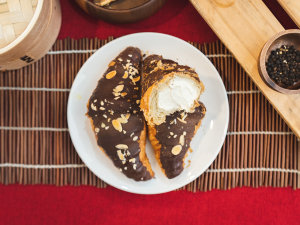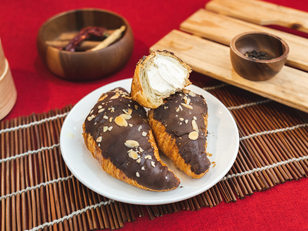 A flaky, buttery crescent-shaped french pastry filled with creamy vanilla cream.